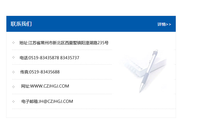 地址:常州市新北區友邦商務大廈1幢16、17層  電話:0519-85101652  傳真:0519-85112595  郵編:213022  網址:www.cz-jiayue_cn.ahzaudi.com  郵箱:xiajifengaa@163.com